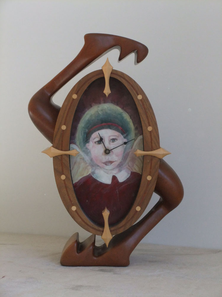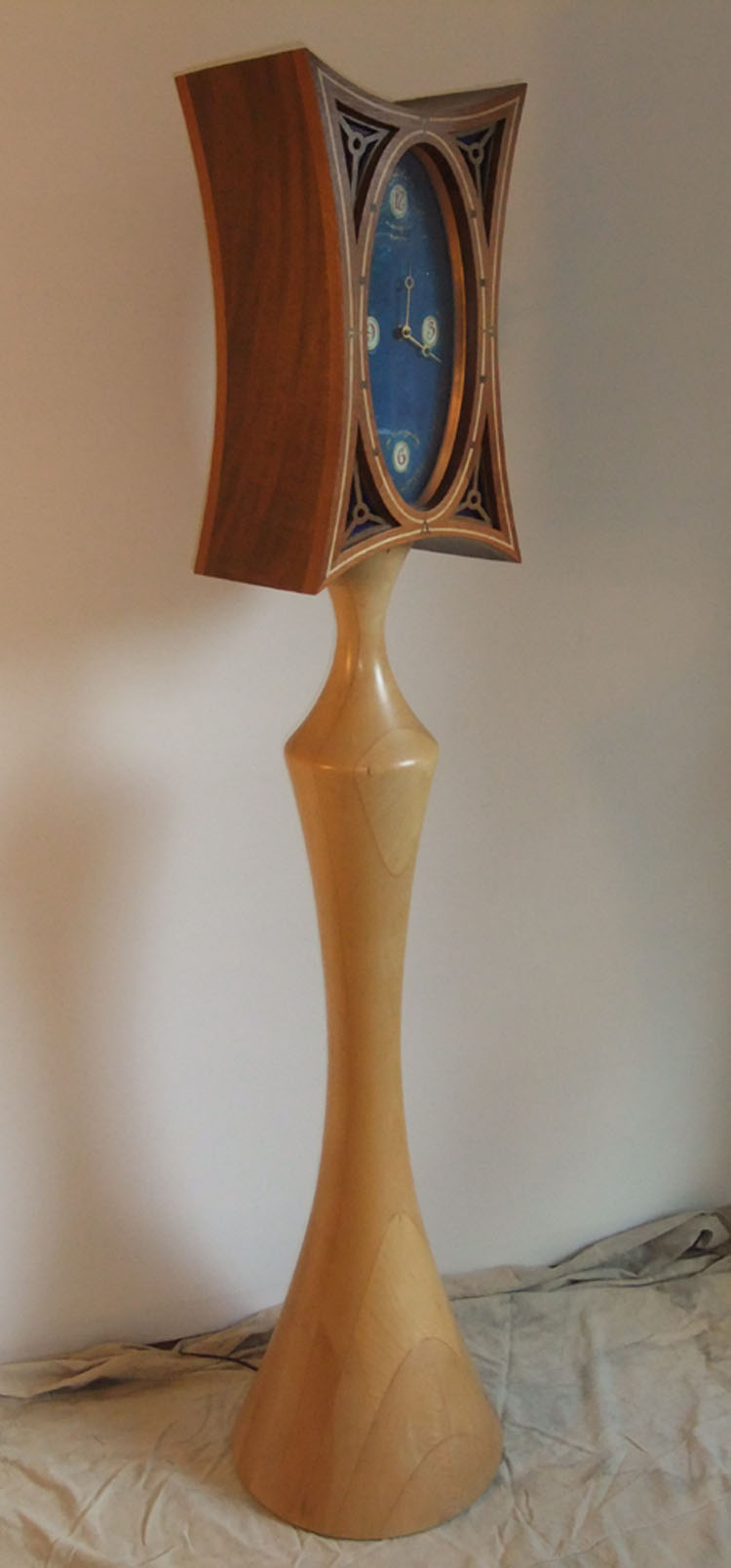 | TABLE CLOCK - WALNUT, MAHOGANY, MAPLE DIAL ART - LAURIE QUIGLEY SWEET |